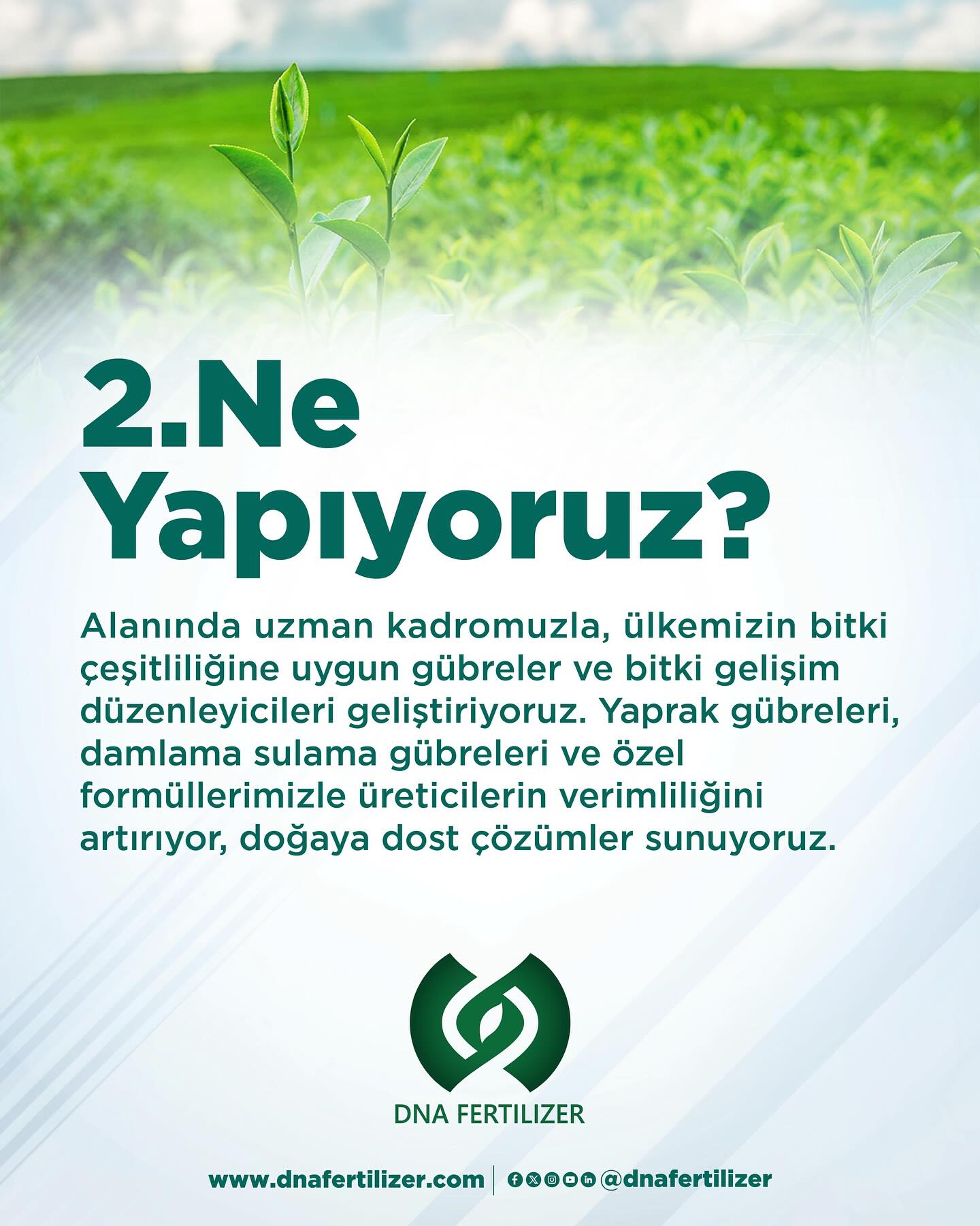 DNA FERTILIZER, bünyesinde bulundurduğu yetenekli ve deneyimli ekip ile ülkemizin ekolojik yapısına ve zengin bitki çeşitliliğine uygun bitki besleme ürünleri geliştirmektedir. Amacımız, tarım sektöründeki gelişmeleri yakından takip ederek, yenilikçi teknolojileri ürünlerimize entegre ederek çiftçilerimize daha verimli ve güvenilir bir yetiştiricilik deneyimi sunmaktır.